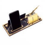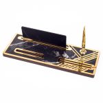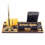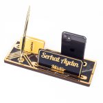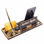Ürün Bilgileri Ürün içeriğinde 28x12cm ebatında toplam 12mm (4 kat ahşaptan) üretilen altın renk dekoratif çerçeveli, gold kalemli masa isimliği bulunmaktadır. Altın renk motifler, gold pleksi ile hazırlanmaktadır. İsimlik üzerinde, telefon ve kartvizit tutucu alan yer almaktadır. İsim yazıları siyah pleksiglass üzerine UV Baskı tekniği ile yazılmaktadır. Ahşap detaylar ürünün kendi deseni olduğundan, her üründe desen farklılıkları olabilmektedir Ürün tükenmez kalem ile birlikte gönderilmektedir. 1 x Ahşap İsimlik 1 x Tükenmez Kalem