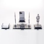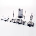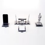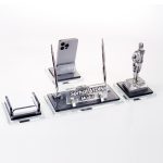 Ürün, masa isimliği, telefon tutucu ve notluk olarak 4 parçadan oluşmaktadır. Ürün iki katlı 8mm kalınlığında kristal camdan üretilmektedir.