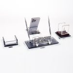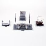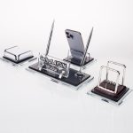 Ürün, masa isimliği, telefon tutucu ve notluk olarak 4 parçadan oluşmaktadır. Ürün iki katlı 8mm kalınlığında kristal camdan üretilmektedir.