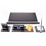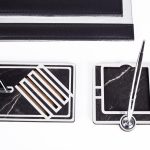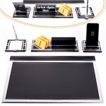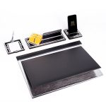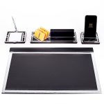 Ürün içeriğinde, 28x12cm ebatında 12mm kalınlığında, kartvizitlikli ahşap isimlik seti, 11x11cm ebatında gümüş kalemli not kağıtlığı ve telefon tutucu mevcuttur.