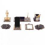 Set içeriğinde 12x12cm ebatında telefonluk, 12x12cm ebatında notluk, 4 adet bardak altlığı ve 10cm yüksekliğinde kalemlik bulunmaktadır.