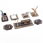 Ürün içeriğinde 28x12cm ebatında toplam 12mm (4 kat ahşaptan) üretilen altın renk dekoratif çerçeveli, gold kalemli masa isimliği bulunmaktadır.