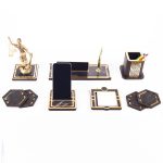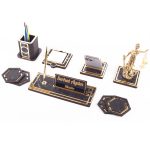 Set içeriğinde 12x12cm ebatında telefonluk, 12x12cm ebatında notluk, 4 adet bardak altlığı ve 10cm yüksekliğinde kalemlik bulunmaktadır.