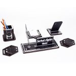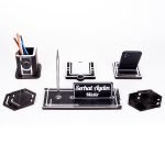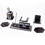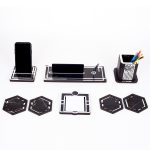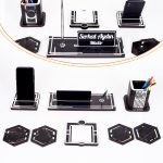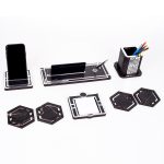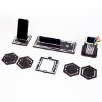 Set içeriğinde 12x12cm ebatında telefonluk, 12x12cm ebatında notluk, 4 adet bardak altlığı ve 10cm yüksekliğinde kalemlik bulunmaktadır.