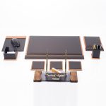 Ana sayfa » Masa İsimlikleri » Tenedos Ahşap Görünüm Deri Sümen Takımı Çift Kalemli Kristal İsimlikli Kabartma Yazılı